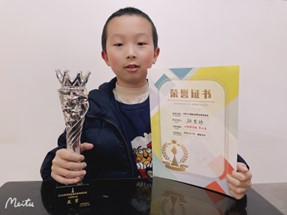学棋初期,也许是兴趣使然,骆思纬对国际象棋知识的接受比较快,半年时间已经学会如何进攻和防守并好好下完一盘棋。2020年初疫情来袭,国象的学习转移到了网上,窝在家里的骆思纬开始每天坚持做蓝宝书答题,偶尔也在国象联盟上找对手切磋,六月份迎来第一次网络定级赛,初生牛犊不怕虎的他五战拿四分跨级晋级为9级棋士,两个月后的又一次网络晋级赛中再次五战四分跨级晋级为7级棋士,等到线下晋级赛重新开启,当骆思纬随着16个小伙伴站到真正的领奖台上时(组别前16名都能上台,骆思纬获得第六),他被震撼到了,原来晋级组别的冠亚季军都有那么漂亮的奖杯,从此一颗梦想的种子在这个“小兵”的心里种下,回家的路上还不忘给我和他爸念叨:“我一定要拿个奖杯回来”。